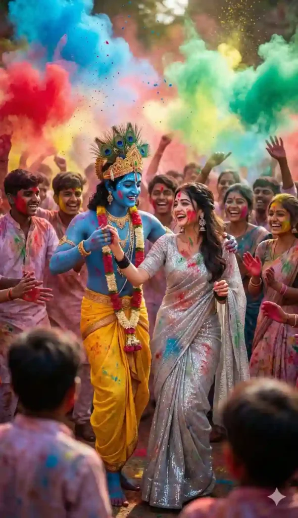 “Ultra-realistic close-up Holi celebration featuring Lord Krishna and a smiling girl dancing joyfully as bright gulal clouds burst around them. Motion freeze effect capturing color particles in sharp detail. Festive crowd in the background softly blurred, cinematic depth of field. Natural sunlight mixed with vibrant color reflections on skin, candid expressions, dynamic movement, ultra-detailed skin texture, photorealistic 8K, sharp focus, high-energy atmosphere, immersive festival vibe.”