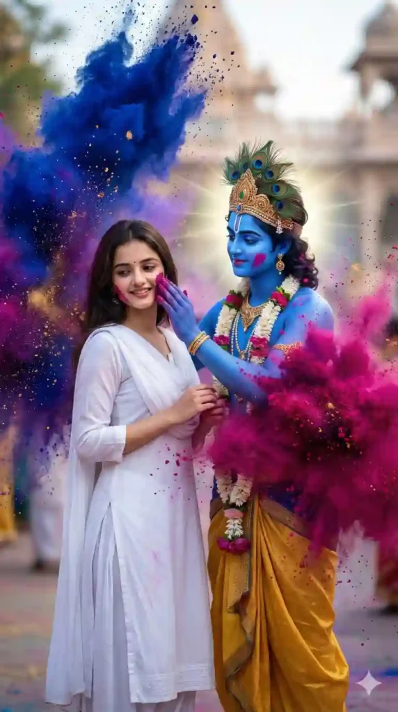 A beautiful young Indian girl standing in the foreground wearing a pure white traditional kurti (slightly flowing fabric, natural skin texture, realistic proportions, no beautification filter, no artificial reshaping). Her expression is soft, joyful, slightly shy, Behind her stands Krishna in a divine godly form – glowing blue aura around him, deep royal blue skin tone, golden pitambar (yellow dhoti), detailed peacock feather crown, fresh flower garland, soft radiant halo light behind his head. Krishna ji gently applying dark pink gulal on the girl’s cheek with a calm, divine smile. His presence feels powerful, protective, and spiritual. Massive high-speed cinematic explosion of Holi colors – dominant dark royal blue and deep hot pink powders bursting dramatically mid-air, mixed with subtle hints of purple and gold dust. Background inspired by Vrindavan – soft temple backdrop.”