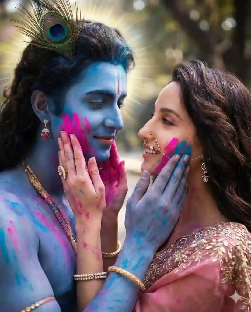 “Stylish cinematic close portrait of Lord Krishna and a young Indian woman applying Holi color on each other’s faces. Emotional eye contact, soft smile, vibrant pink and blue powder on cheeks, shallow depth of field, slightly cropped mid-frame composition, dramatic lighting, glowing divine aura, high contrast, fashion-editorial style, ultra-realistic skin texture, HD clarity, 8K portrait mode.”