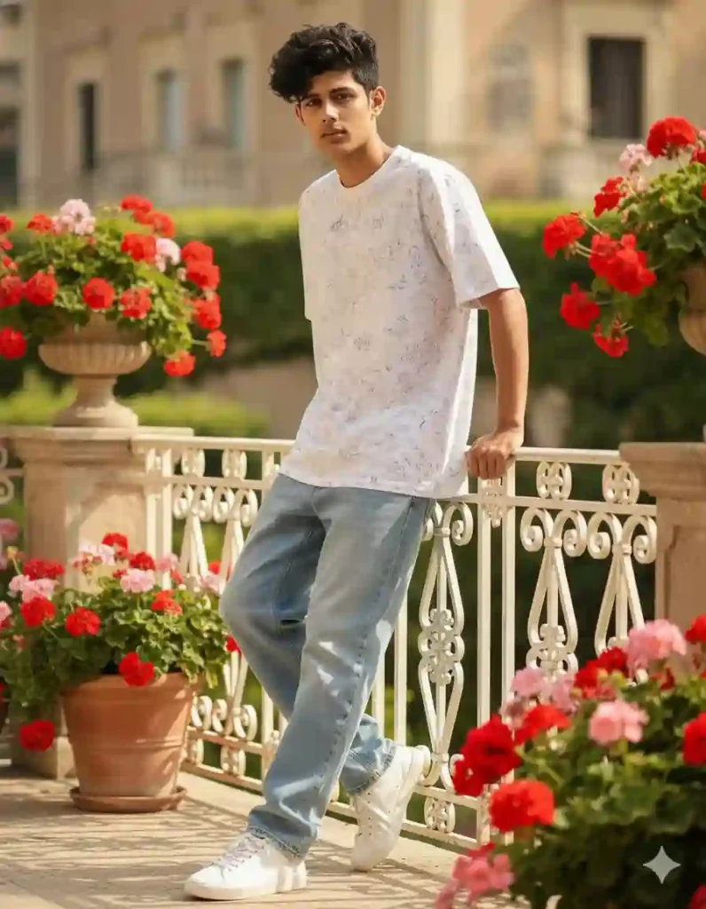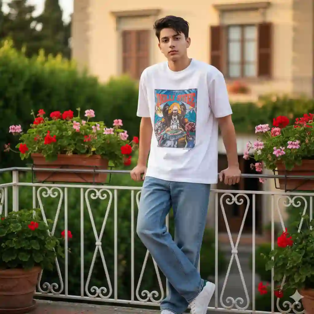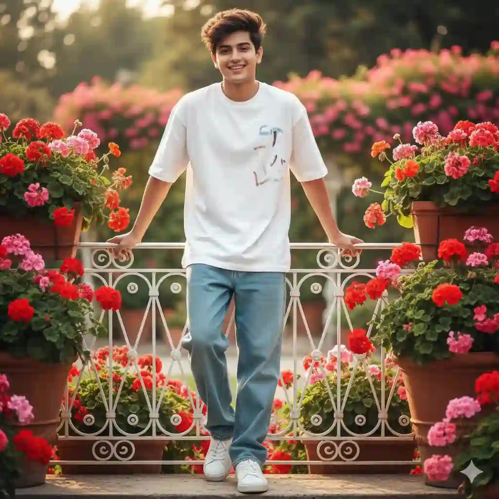 “Give the exact same face in 8K ultra-realistic quality. Medium full-shot of a stylish young man with messy hair leaning on a white wrought-iron balcony. He wears a printed oversized white T-shirt, baggy blue jeans, and white sneakers. The setting is a lush Italian villa garden filled with vibrant red and pink geraniums. Soft natural sunlight creates a warm cinematic atmosphere with blurred architectural background. Do not change anything.”