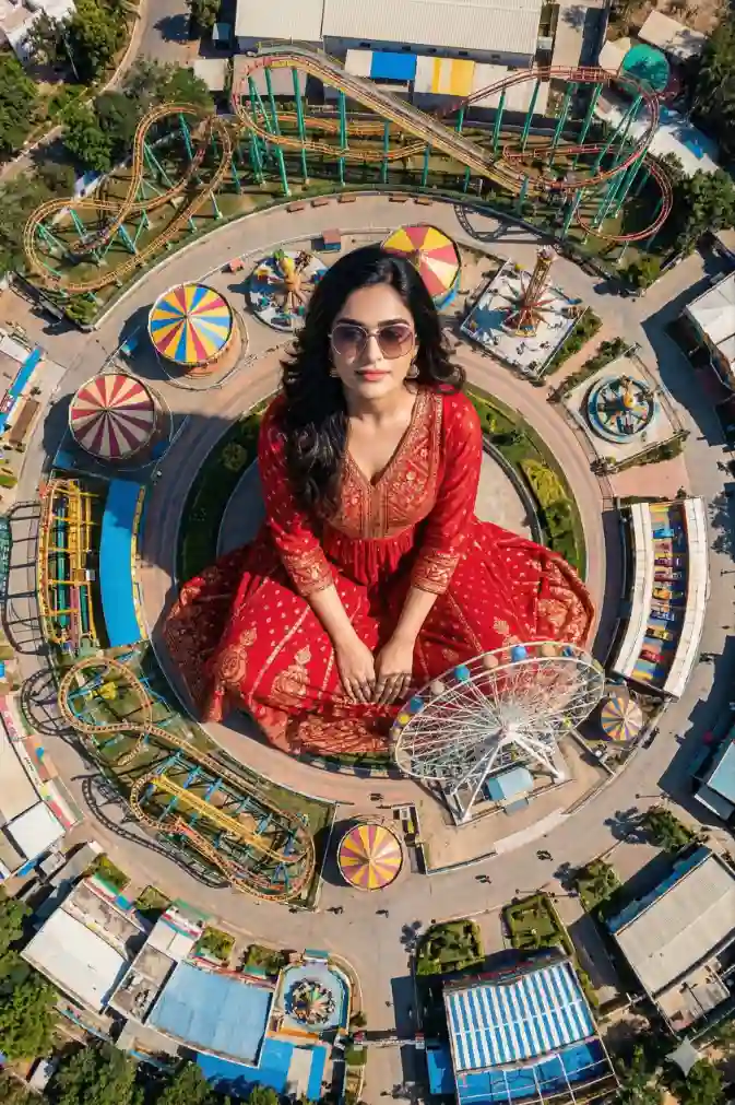 "Highly cinematic surreal portrait of a gigantic woman sitting calmly inside an amusement park landscape, wearing flowing red dress with gold patterns and large stylish sunglasses, colorful carnival rides orbiting around her like miniature toys, ferris wheel touching near her knee, aerial drone top-down shot using 24mm wide lens, bright summer daylight, dramatic color contrast, strong radial composition of roller coasters surrounding the giant subject, hyper-realistic skin and fabric texture, ultra crisp environment details, cinematic lighting, deep depth clarity, HDR rendering, 8K surreal photography"