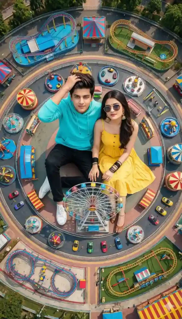 "Highly cinematic surreal scene of a giant couple sitting together inside a vibrant amusement park, man wearing cyan hoodie and black jeans, woman wearing yellow summer dress and sunglasses, amusement rides arranged in circular pattern around them, ferris wheel near their knees, roller coasters appearing as miniature mechanical toys, aerial drone top-down perspective captured with 24mm lens, bright daylight, vivid carnival color palette, strong radial composition, ultra-realistic facial textures, detailed fabric folds, cinematic lighting and shadows, deep depth of field, 8K hyper-realism"