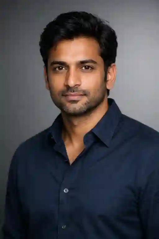 "Waist-up portrait of an Indian man, neutral grey backdrop, soft diffused lighting from one side, sharp focus on eyes, relaxed shoulders, premium studio finish."