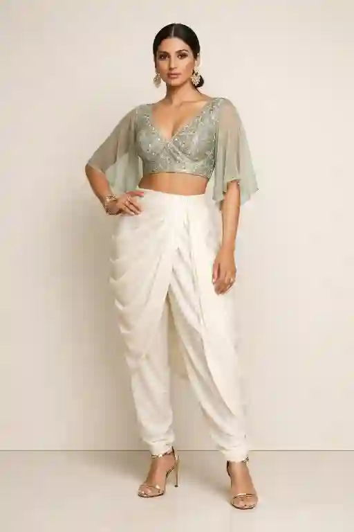 "Full-body portrait against a plain beige wall, balanced studio lighting, confident stance, contemporary Indian outfit, clean composition, high-end magazine style."