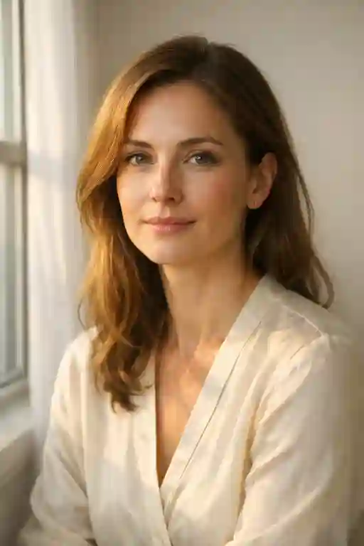 "Indoor portrait near a large window, warm daylight falling on face, subtle shadows, minimal background, calm expression, realistic skin texture, elegant framing."