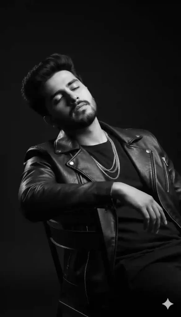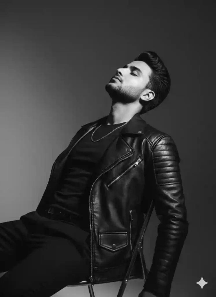 “Generate a cinematic black and white fashion portrait of a young man in a studio setting. He leans back on a simple chair, chin raised slightly, eyes closed in a reflective mood. He wears a fitted dark tee layered with a bold leather jacket and subtle metallic chain necklace. Use dramatic studio lighting from one side to create contrast, highlighting fabric textures and facial structure. Background should be clean and minimal with soft shadow gradients.”