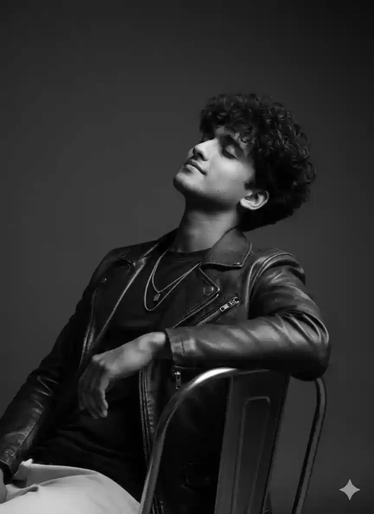 “Produce a high-contrast black and white studio portrait featuring a confident young man with messy hair. He reclines slightly against a chair, one arm draped over the backrest, the other resting naturally. His eyes remain closed and chin subtly lifted, conveying intensity. Outfit includes a classic leather jacket and simple dark tee with layered chain detail. Use controlled directional lighting to sculpt the face and emphasize strong shadows for a bold cinematic look.”