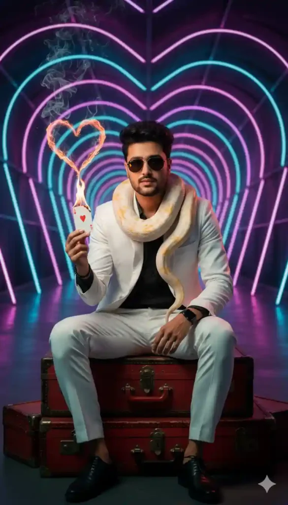 “Generate a luxury cinematic portrait in 4:5 ratio of me in a white suit seated on distressed red vintage trunks. An albino python drapes around my shoulders naturally. I hold a burning Ace of Hearts card with glowing embers and smoke shaping into a heart. Neon pink, purple, and blue heart tunnel behind me with soft haze. Teal-orange color grading, fashion editorial lighting, intense confident pose, aviator sunglasses, sharp facial detail, realistic skin texture, dramatic shadows, exact face match, high-resolution output.”