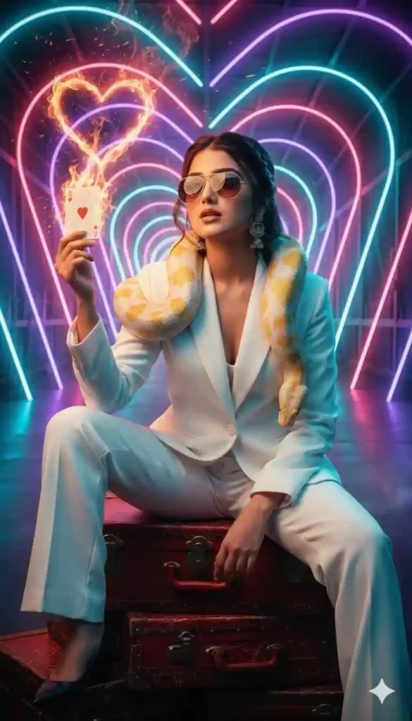 “Produce a cinematic movie-poster style 4:5 portrait using my exact face. I am wearing a clean white suit, sitting relaxed yet dominant on red vintage trunks. An albino python coils around my shoulders realistically. In my hand, a burning Ace of Hearts card emits sparks and smoke forming a glowing heart. Neon pink-purple-blue heart tunnel background with volumetric light rays. Teal-orange grading, ultra-sharp detail, shallow depth of field, confident expression, aviator sunglasses reflecting firelight, dramatic high-contrast lighting.”