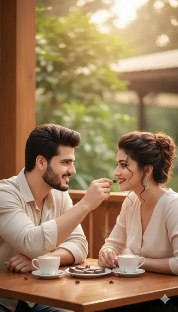 “Reference only the uploaded photo for identity accuracy. Keep faces 100% unchanged and realistic. No swaps, no new people. Create a cute Chocolate Day couple café shot: man feeding chocolate, both smiling and looking at each other. Relaxed posture and correct anatomy. Wooden café table, desserts and mugs present, blurred green background, warm daylight tone, cinematic depth, ultra-realistic photography quality, lifestyle shoot style, no stylised art effects.”