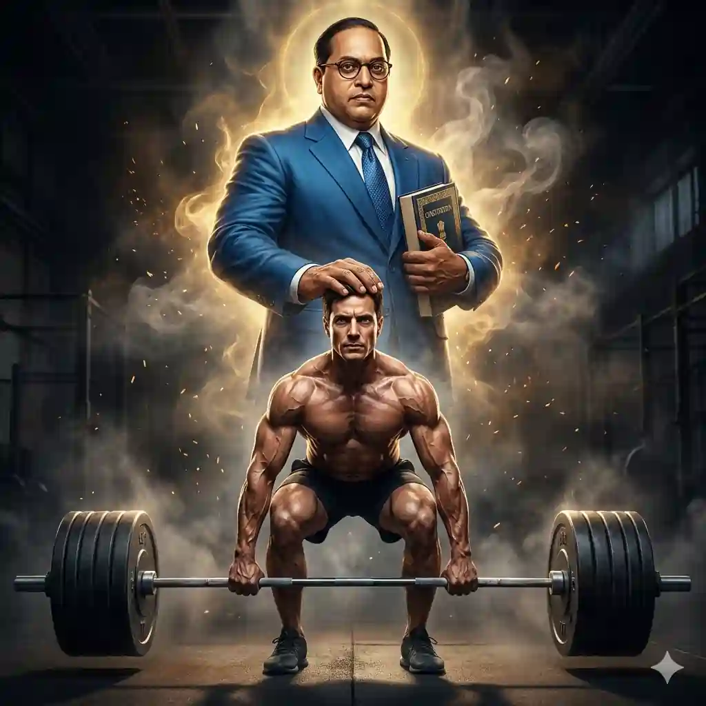 AI image generation is moving beyond simple portraits into layered cinematic storytelling. One trending style blends athletic realism with symbolic figures that represent discipline, knowledge, and inner power. This prompt concept builds a dramatic gym deadlift scene featuring a powerful Indian male athlete and a divine warrior interpretation of Dr. B R Ambedkar as a symbolic force – not interacting physically, but representing moral and mental strength behind the lifter.