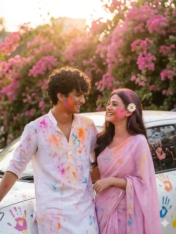 Candid couple portrait during Holi festival, Indian man in white shirt and Indian woman in pastel pink saree, both covered in colorful gulal powder. Leaning together against a white car splashed with Holi paint. Pink bougainvillea flowers behind them, warm sunset glow, soft backlight creating glowing hair edges. 85mm lens, f/2.0 aperture, shallow depth of field, cinematic DSLR photography, 8K ultra HD, realistic skin tones, detailed fabric texture, joyful mood.