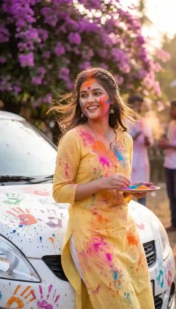 Ultra-realistic outdoor portrait of a young Indian woman celebrating Holi, wearing a flowing yellow kurta splashed with vibrant pink and orange gulal. Soft smile, wind in hair, leaning against a white car with paint-splattered hood. Blooming bougainvillea backdrop, golden hour lighting, soft rim light around hair. Shot on 85mm lens, cinematic DSLR look, shallow depth of field, 4K resolution, creamy bokeh, ultra-detailed skin texture, high dynamic range, vibrant color realism.