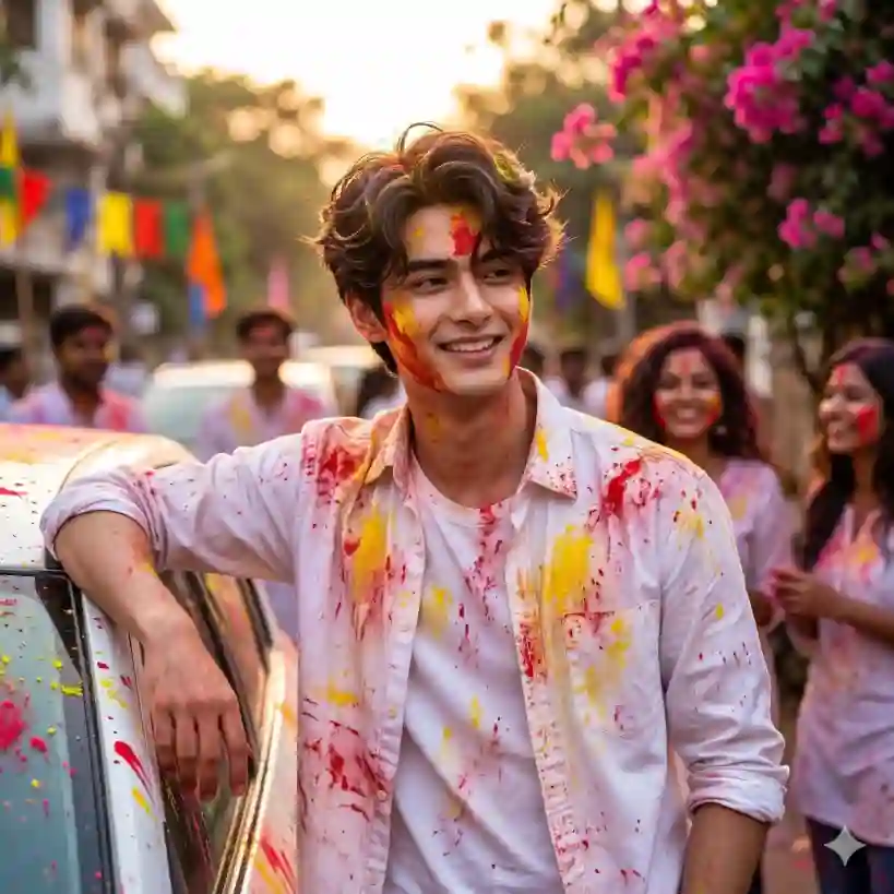 Ultra-realistic candid outdoor portrait of a young Indian man celebrating Holi, wearing a white button-down shirt splashed with red, yellow, and pink gulal powder. Stylish messy hair, warm natural smile, leaning casually on a white car door covered in colorful Holi paint. Bougainvillea bushes with pink blossoms in background, soft evening daylight, peach skin glow, cinematic backlit hair strands. Shot on 85mm lens, f/1.8 aperture, shallow depth of field, creamy bokeh, high contrast, DSLR photography, 8K resolution, hyper-detailed skin texture, sharp facial focus, natural tones.
