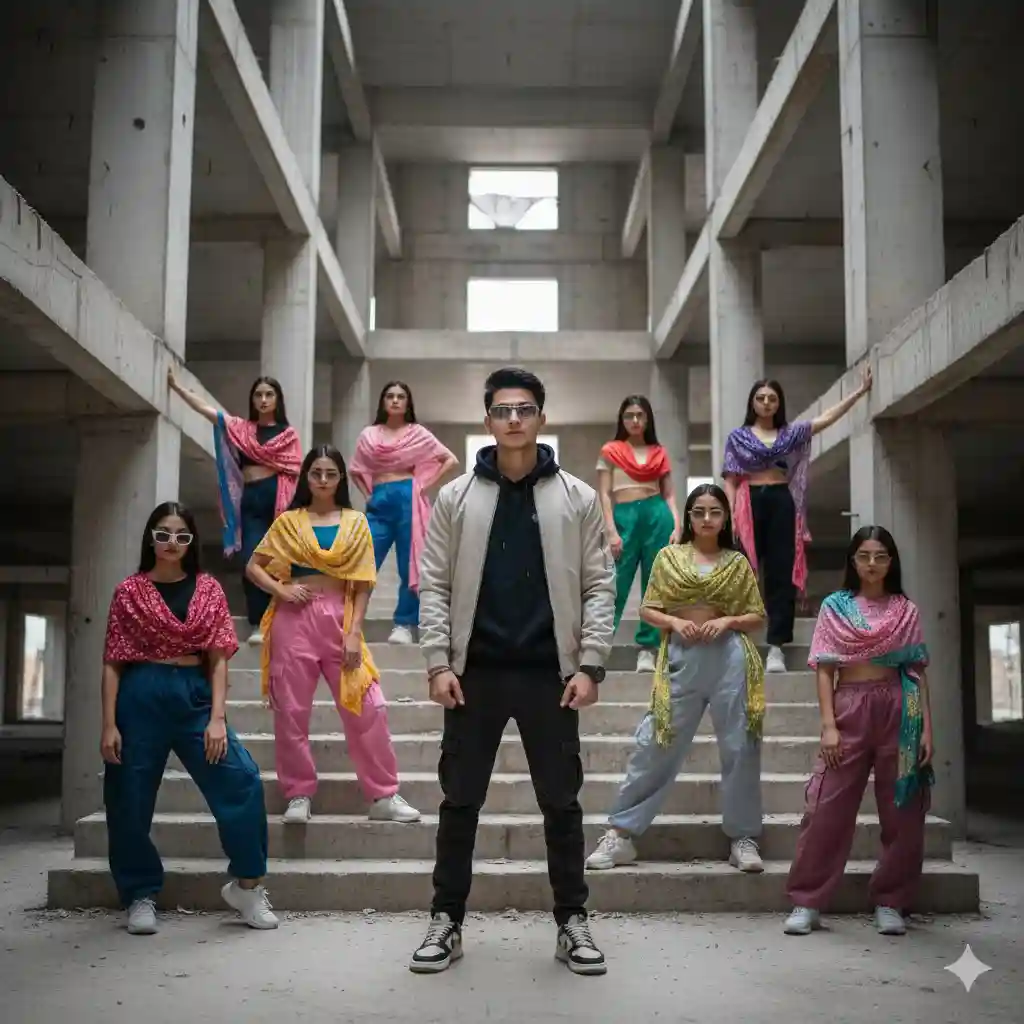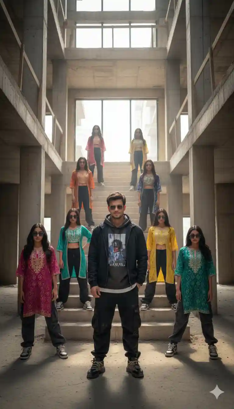 “Create an ultra-realistic, high-resolution group portrait inside a semi-constructed concrete building. Eight young South Asian women wearing colorful orna, baggy pants, crop tops, and stylish sunglasses are standing at different levels of the unfinished structure. Some are on steps, some leaning against raw concrete beams, all with confident attitude poses. In the foreground center, a stylish (Upload Image Reference) man stands with strong posture, sharp jawline focus, modern streetwear, sunglasses, cinematic lighting, natural skin tones, detailed textures, ultra-HD clarity, shallow depth of field, magazine-style composition.”