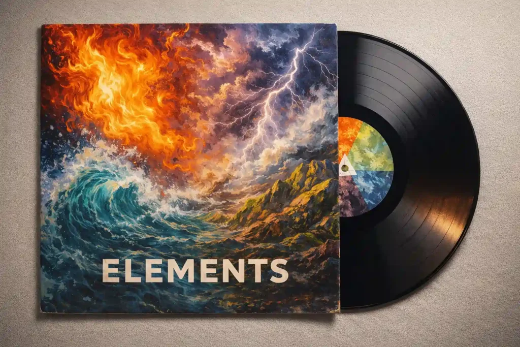 Create a conceptual album cover presented as a physical vinyl record sleeve.
