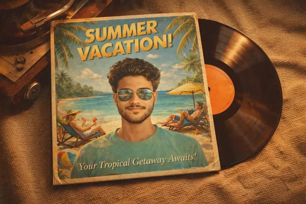 Design a retro-style album cover shown as a real vinyl record sleeve.