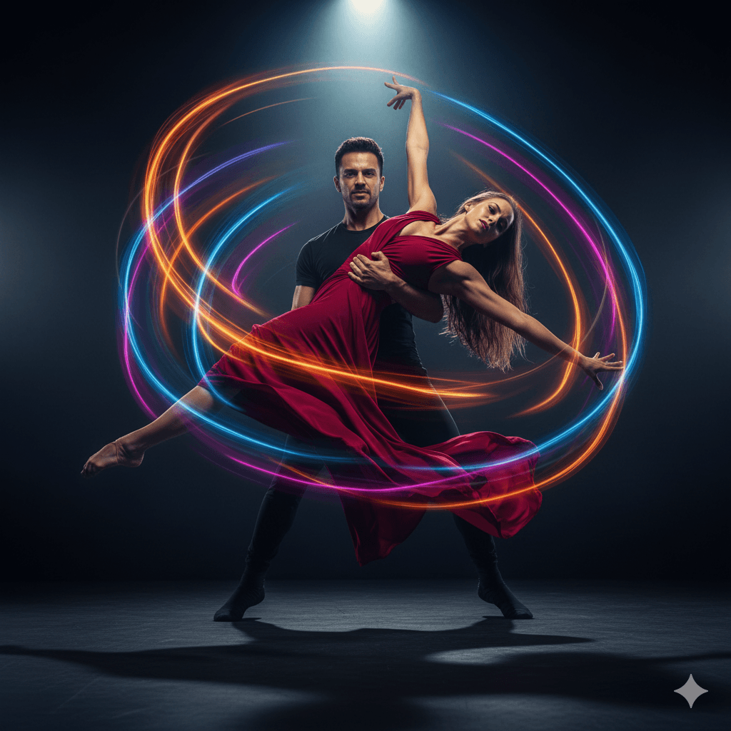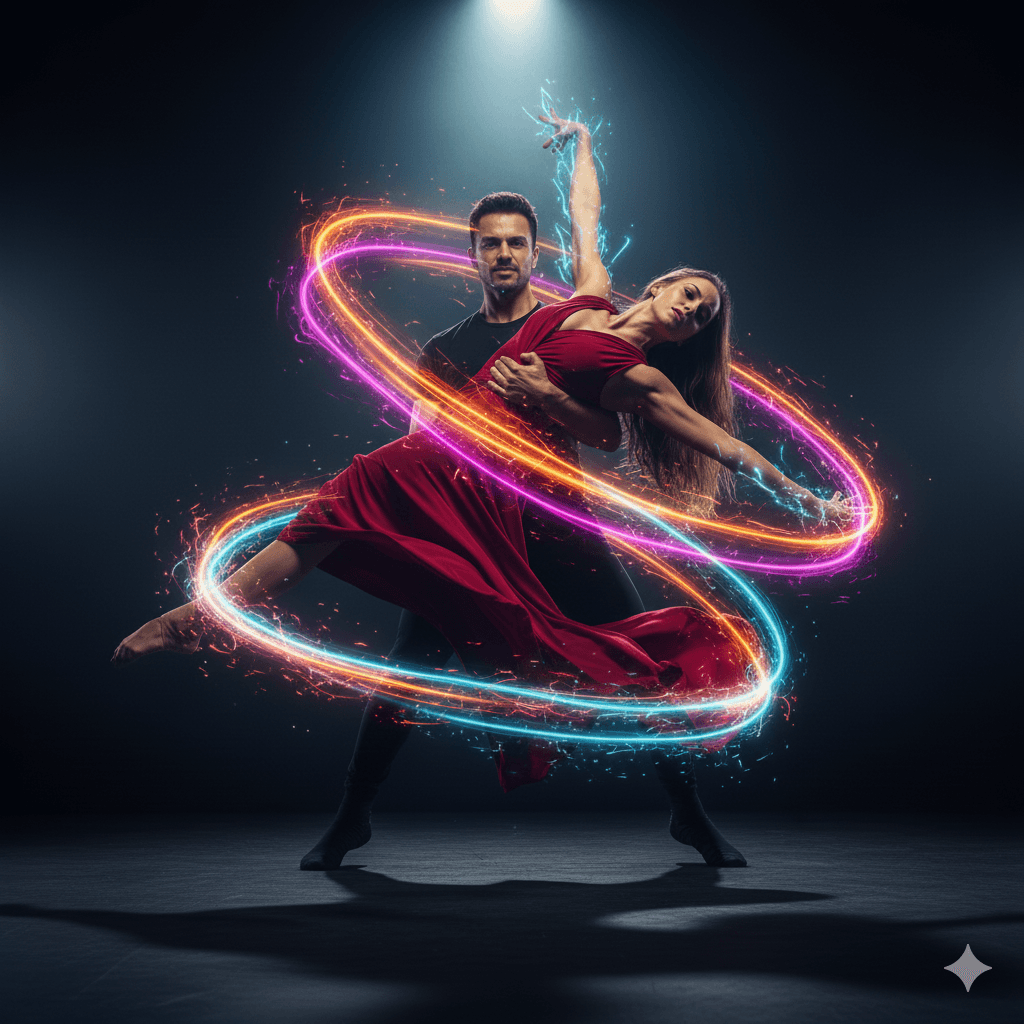 Generate an ultra-realistic dance couple edit showing electric chemistry between the partners. Add soft neon sparks and energy waves around their bodies, flowing with their movement. Use cinematic lighting, warm highlights on skin, dark contrasting background, shallow depth of field, crisp facial details, and a dramatic yet romantic performance mood.