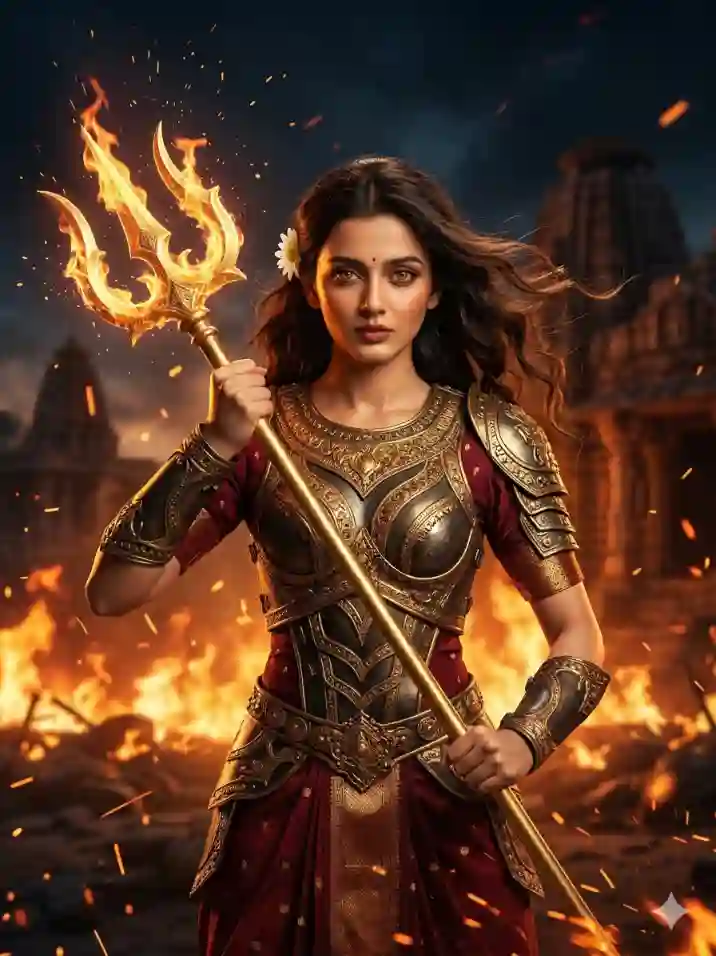 "Epic mythological Navratri warrior portrait, same person as reference image, wearing battle-ready armor, holding trishul with fire effects, blazing background, glowing eyes, strong confident pose, cinematic composition, 35mm lens, motion depth, realistic textures, dramatic lighting, ultra HD 8K, high detail skin texture, fantasy realism, powerful aura, identity preserved"