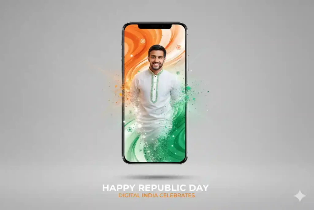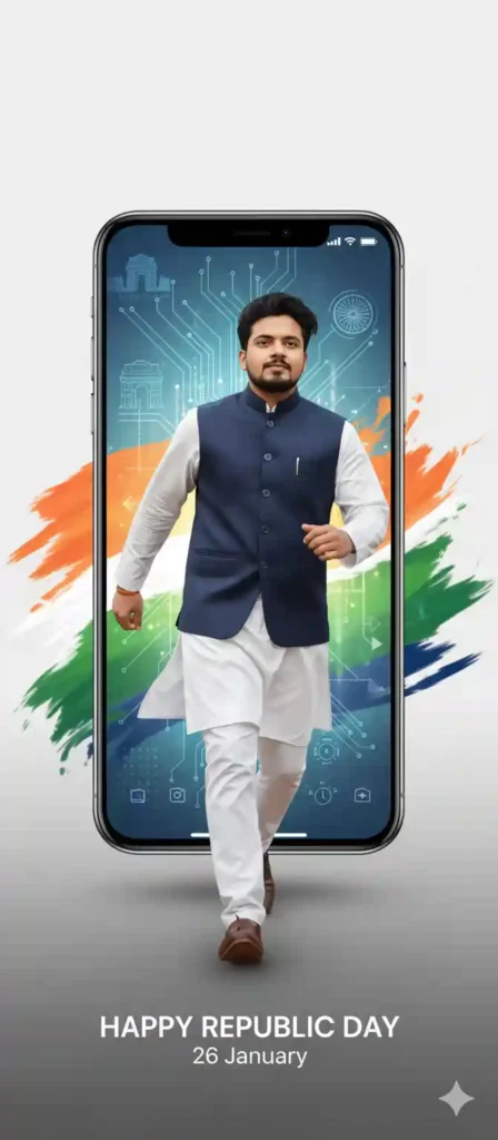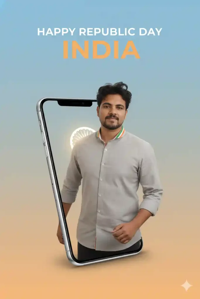“A realistic modern Republic Day poster of a young Indian man emerging from a floating smartphone screen, confident expression, natural face unchanged, soft studio lighting, tricolor accents, minimal background, sharp focus, professional poster style, high contrast, clean shadows, social media ready, 4k quality, respectful patriotic mood, realistic skin texture, balanced colors, modern Indian digital art aesthetic.”