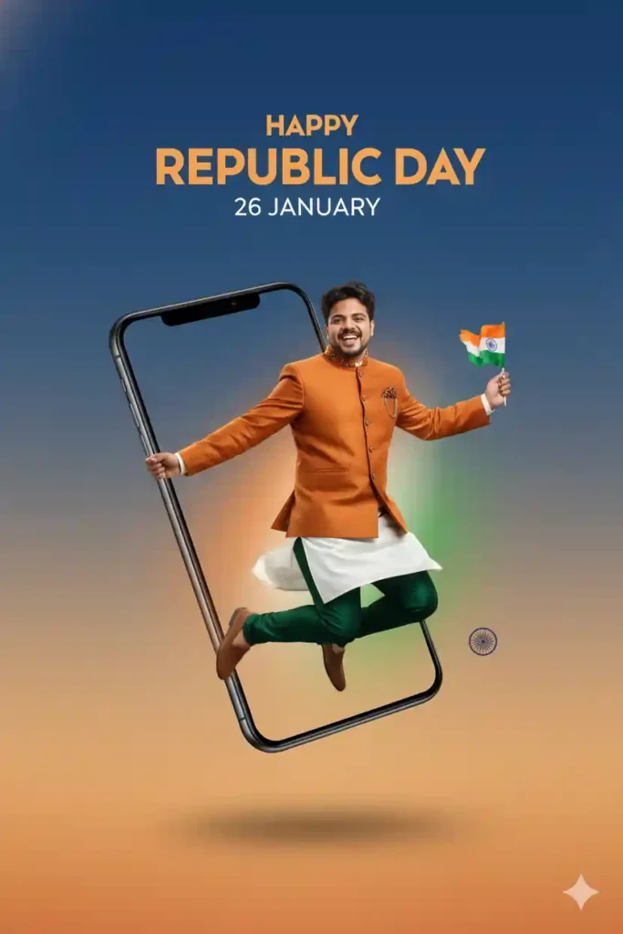 “Create a high-resolution Republic Day poster showing a young Indian youth jumping out of a tilted smartphone frame, joyful yet proud expression, original face preserved, subtle tricolor glow, smooth gradient background, realistic shadows, studio lighting, ultra-sharp details, modern Photoshop composite style, clean composition, festive but dignified tone, social media creative design, 4k clarity.”