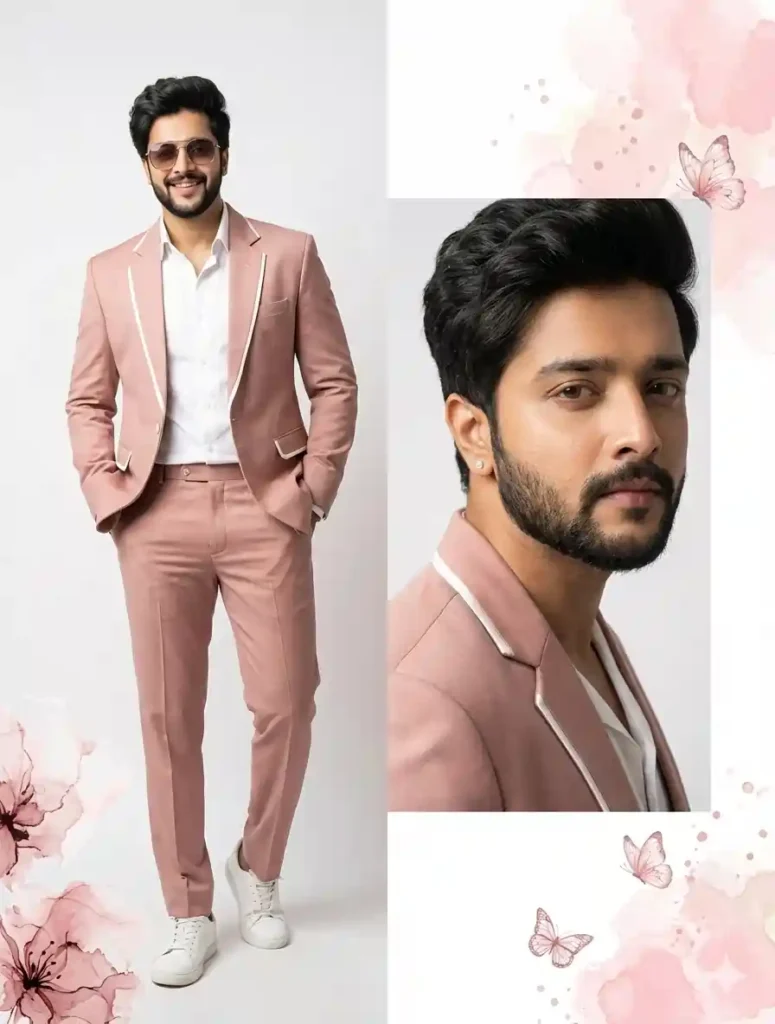 The first pose sets the tone. A full-body stance, relaxed yet confident, dressed in a blush-pink tailored outfit with white accents. Sunglasses and a soft smile add polish, not noise. It feels like a luxury fashion editorial you’d see in a high-end magazine.