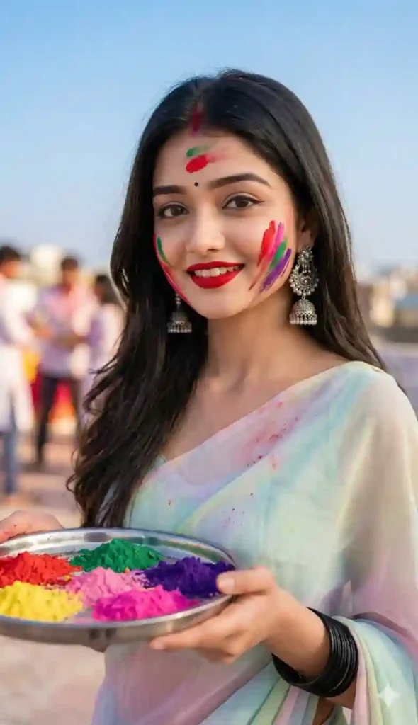 “Ultra-realistic 8K DSLR portrait of a young Indian woman celebrating Holi, captured from a slight side angle while gently looking toward the camera. Holding a decorative thali with red, pink, green, and purple colors. Soft gulal streaks on forehead and cheeks, black bindi, red lipstick, silver jhumkas, pastel saree flowing naturally. Warm daylight glow, blurred rooftop terrace background, shallow depth of field, sharp focus on eyes, natural skin tones, vibrant festive atmosphere, high-detail professional photography.”