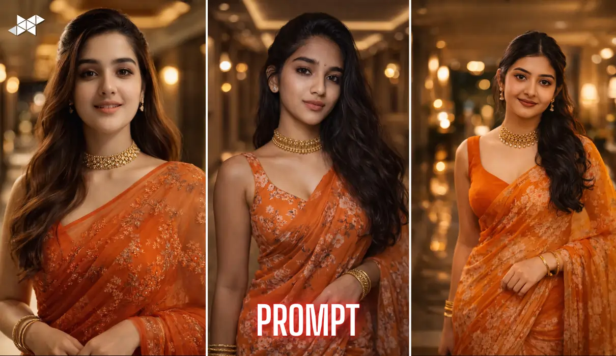 “Using the uploaded selfie strictly for facial reference, create a high-fashion cinematic portrait of an Indian woman. She is styled in an orange chiffon saree with soft floral detailing and a tasteful deep-neck blouse. Add traditional Indian gold jewellery including a refined choker, slim bangles, and minimal earrings. Her hair is long, wavy, half-tied with natural volume. Makeup is subtle and realistic with luminous skin, gentle smoky eyes, and nude lips. Scene takes place at night inside a luxury hotel corridor with warm ambient lighting and elegant bokeh. Confident expression, editorial pose. Shot on professional DSLR, shallow depth, cinematic lighting, ultra-detailed skin texture, 8K quality.”