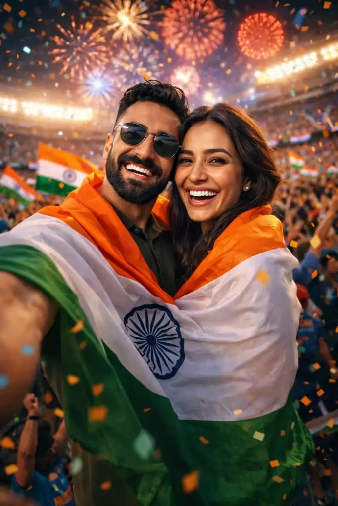 "Create a joyful couple selfie celebrating India's thrilling cricket victory against New Zealand. A smiling couple wrapped in the Indian flag stands together in a stadium crowd. Colorful fireworks explode in the background while fans cheer and wave flags. Stadium lights glow warmly above them, and confetti fills the air creating a festive scene. The couple’s expressions show excitement and pride. Capture the image in a cinematic lifestyle photography style using a 50mm lens look with soft depth of field, vibrant colors, and ultra-realistic lighting."