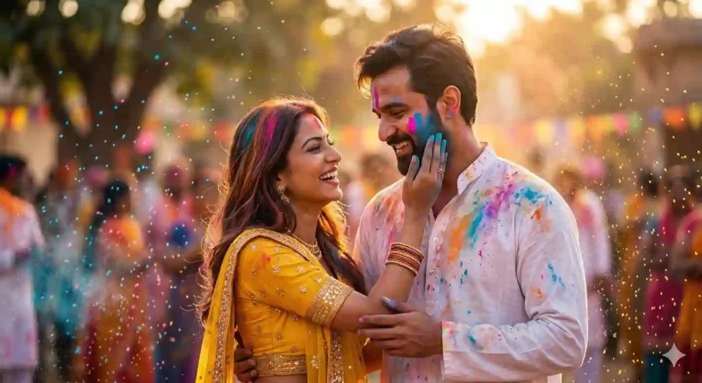 Holi couple portraits are trending across AI art platforms.
