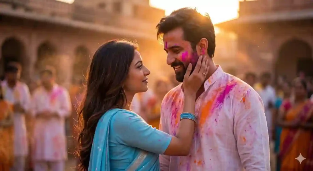 Holi celebration courtyard scene, woman in sky-blue saree gently holding his face.