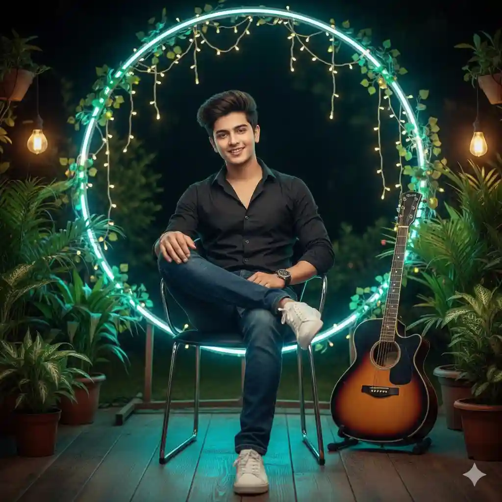 “Generate a stylish night garden portrait using my exact face without altering facial structure. I am sitting calmly on a modern chair with legs crossed, wearing a black shirt, blue jeans, and white sneakers. Add a bright circular neon ring behind me with fairy lights hanging naturally and green leaves decorating it. Include a wooden floor setup, soft glowing plants, an acoustic guitar beside the chair, vibrant yet balanced colors, smooth skin tone, and creamy cinematic bokeh. Ensure soft depth of field while keeping my face crystal clear and highly detailed.”