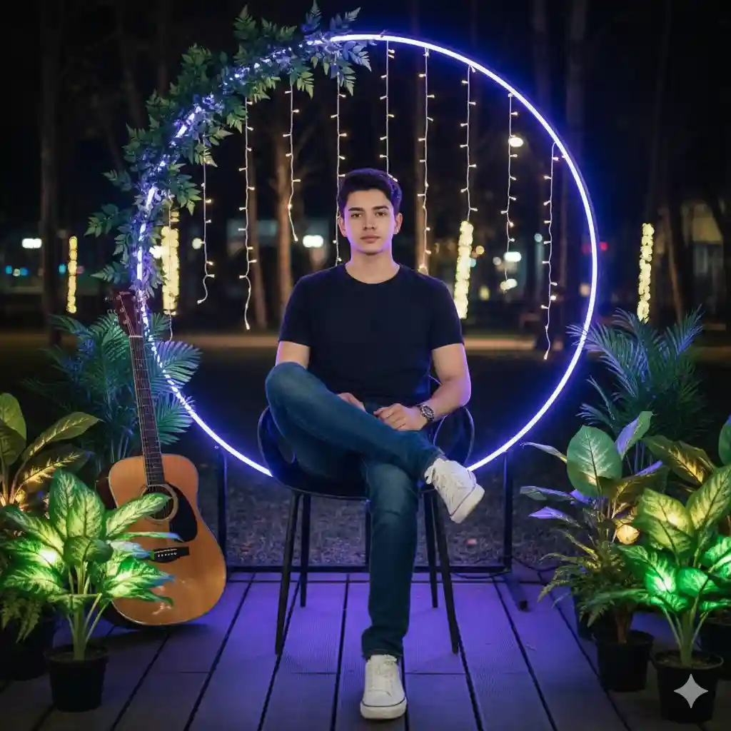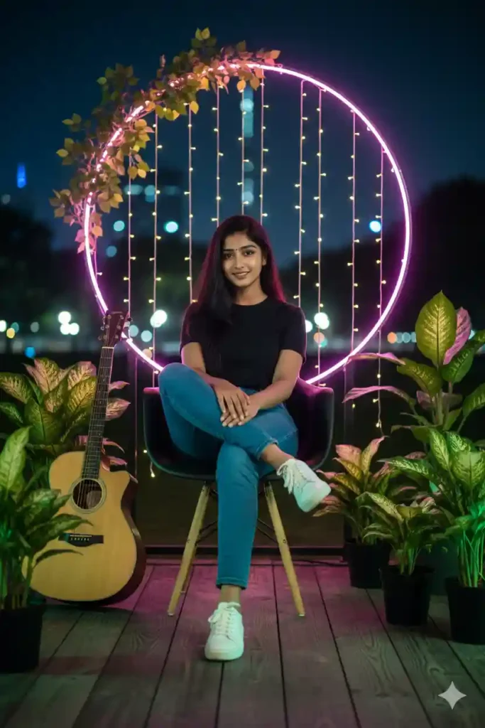 “Create a trendy cinematic portrait using my real face with 100% accuracy. I am sitting confidently on a modern minimalist chair outdoors at night, legs crossed naturally. Outfit: black shirt, blue denim jeans, white sneakers. Behind me, design a glowing circular neon halo decorated with fairy lights and green foliage. Add potted plants, wooden floor texture, acoustic guitar resting beside me, vibrant colors, ultra-HD sharp facial focus, natural skin texture, professional depth of field, smooth background blur, dramatic yet soft lighting.”