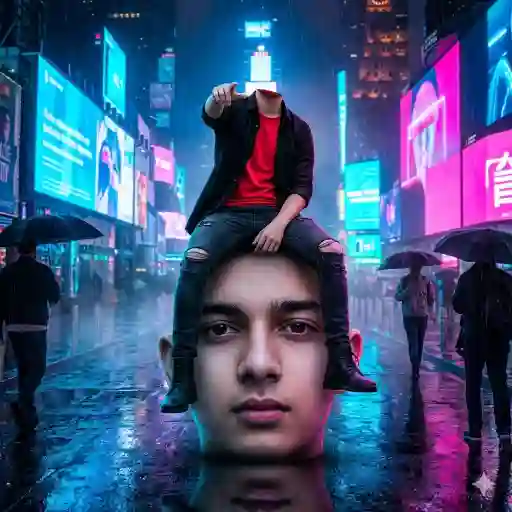 "Surreal cyberpunk digital artwork of a headless young man sitting confidently on a giant hyper-realistic human head in a rainy neon-lit cyberpunk street at night, black open shirt over bright red t-shirt, dark ripped skinny jeans, black boots, pointing forward dramatically, glowing holographic billboards and neon signs reflecting on wet asphalt, cinematic blue and pink lighting, futuristic city atmosphere, volumetric fog, dramatic reflections, ultra-realistic skin texture on giant head, sharp details, shallow depth of field, shot on 50mm lens, high contrast lighting, photorealistic, highly cinematic composition, 8K resolution, cyberpunk aesthetic"