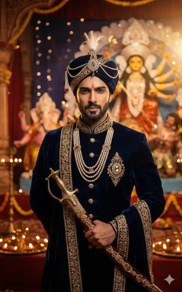 "Highly cinematic Navratri Royal King AI Portrait, same subject transformed into a regal Indian king, detailed sherwani with gold embroidery, dramatic lighting with warm highlights and deep shadows, grand festive pandal with Durga idol in background, glowing lamps and bokeh lights, 50mm lens, creamy depth of field, realistic textures, emotional royal mood, ultra sharp face, HDR lighting, 4K to 8K ultra HD, cinematic storytelling frame"