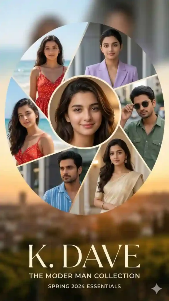 “Highly cinematic spiral portrait poster design with circular spiral collage frame, featuring multiple portraits of a stylish young woman in different outfits: red summer dress near beach, lavender blazer fashion look, green casual shirt with sunglasses, elegant cream saree portrait, central soft smiling close-up in center circle, geometric radial spiral slices forming modern poster layout, warm studio lighting mixed with soft daylight glow, shot on 85mm prime lens, shallow depth of field, detailed hair strands and fabric textures, natural skin realism, editorial fashion poster style, HDR lighting, 8K ultra-detailed resolution.”