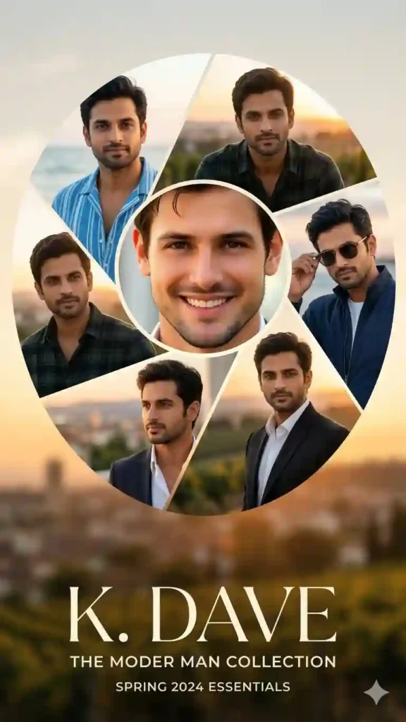 “Highly cinematic spiral portrait poster design featuring a circular collage layout at the top center, radial segmented spiral photo frame containing multiple portraits of a handsome young man wearing different outfits: blue striped beach shirt, dark green plaid shirt, navy jacket with sunglasses, elegant black formal blazer, center close-up smiling portrait, modern geometric spiral slices forming a clean radial collage, soft golden sunset lighting, DSLR 85mm portrait lens, shallow depth of field, creamy bokeh background, ultra-realistic skin texture, natural fabric detail, cinematic color grading, 8K resolution, high dynamic range, modern editorial poster composition.”