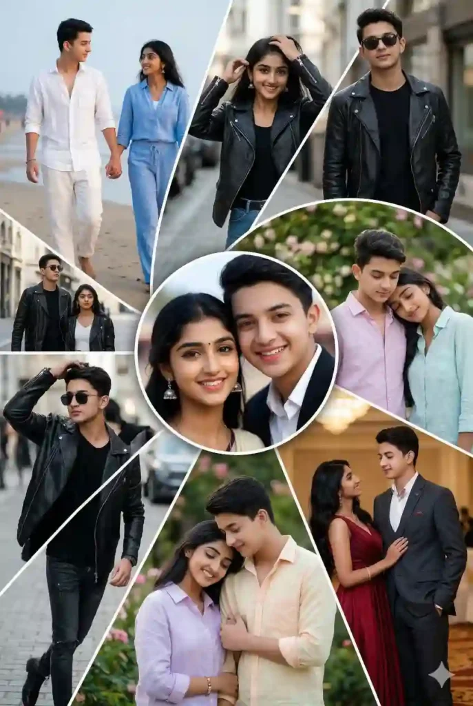 “Highly cinematic spiral collage poster featuring a couple inside a circular segmented spiral photo frame, radial slices showing different moods: casual beach walk outfits in white and blue, stylish urban black jackets with sunglasses, soft romantic pose in pastel outfits, elegant formal evening look in deep red dress and charcoal suit, center circle smiling couple portrait, clean geometric spiral design creating modern collage poster, dramatic cinematic lighting with soft rim light, captured on 50mm prime lens, shallow depth of field, natural skin tones, detailed clothing texture, professional poster composition, ultra realistic 8K resolution.”