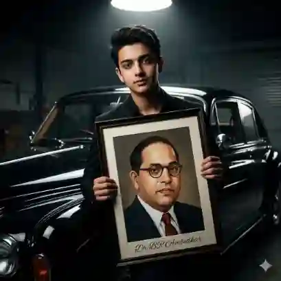 “Low ultra-wide angle ultra-realistic front close-up 8K portrait of a stylish young man with the same face as the uploaded image, wearing black clothes. He leans against a glossy black vintage luxury car inside a dim garage. Both hands holding a large framed photograph of Dr. B. R. Ambedkar. Dramatic rim lighting from a single overhead source, cinematic shadows, luxury editorial photography style, moody atmosphere, polished car reflections, deep contrast, skin texture hyper detailed, 85mm lens, shallow depth of field, ultra sharp focus, film grain realism, studio grade lighting, ultra photorealistic, 8K resolution, photo frame signature ‘DR BR Ambedkar’ alex brush font.”
