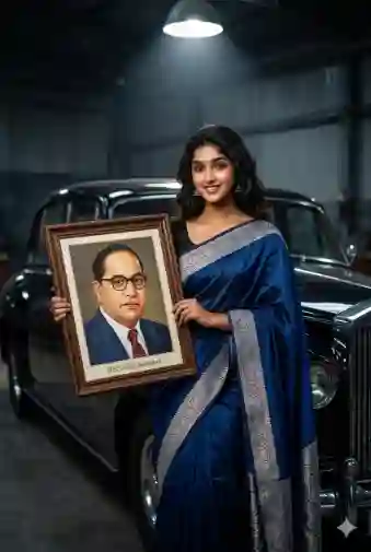 “Ultra-realistic cinematic 8K portrait of a stylish young woman, wearing deep blue saree with silver border and black blouse, standing beside a glossy vintage black car in a dim industrial garage. She holds a large framed portrait of Dr. B. R. Ambedkar with both hands. Dramatic rim lighting from overhead spotlight, soft ambient shadows, editorial fashion photography style, rich texture fabrics, reflective car surface, 50mm lens, shallow depth of field, ultra detailed skin texture, cinematic lighting, luxurious mood, photorealistic clarity, ultra sharp focus, 8K resolution, photo frame signature ‘DR BR Ambedkar’ alex brush font.”