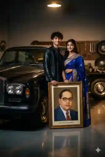 “Ultra-realistic cinematic 8K editorial portrait of a stylish couple, man wearing black jacket and woman wearing royal blue saree, standing beside a polished vintage black luxury car in a dim garage environment. Both holding a large framed portrait of Dr. B. R. Ambedkar together. Dramatic rim lighting from a single overhead source, cinematic shadows, reflective glossy floor, luxury editorial photography tone, 35mm lens, shallow depth of field, ultra detailed fabric texture, photorealistic skin tones, cinematic mood lighting, ultra sharp focus, film style realism, 8K resolution, photo frame signature ‘DR BR Ambedkar’ alex brush font.”