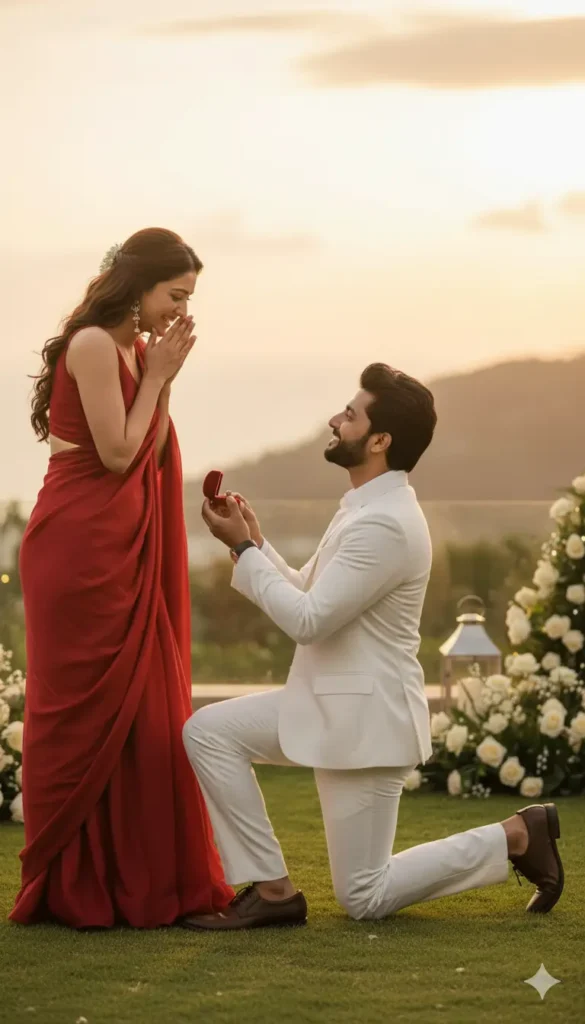 “Reference the uploaded couple photo and copy identities exactly. Do not alter facial structure, eyes, skin color, or expressions. Generate a real proposal moment pose with natural interaction — man on one knee, woman emotional and smiling. Change only outfit and scene. Use luxury garden sunset environment, cinematic composition, soft golden light, realistic shadows, DSLR clarity, shallow focus, premium engagement photography style, no cartoon or stylized rendering.”