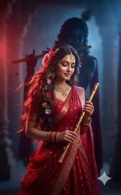 “Ultra-realistic cinematic close-up portrait of Radha Rani, waist-up composition, glowing radiant skin, subtle natkhat smile with calm expression, eyes gently lowered. Wavy hair softly moving in breeze, wearing rich red lehenga with golden shimmer texture, adorned with fresh flowers, holding golden flute gracefully. Behind her, Krishna’s dark shadow silhouette with bansuri and peacock feather softly visible. Balanced red and blue cinematic lighting, dreamy atmosphere, shallow focus, divine magical glow, 4K ultra-HD detail.”
