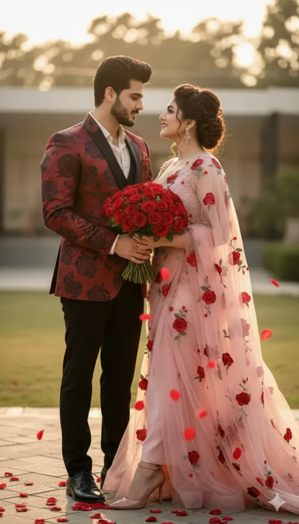 “Use this uploaded photo as strict reference for both individuals. Keep facial structure, skin tone, pose, and body proportions unchanged. Do not generate new faces. Replace only outfits with rose-day romantic fashion palette — reds, beige, blush tones. Include natural rose elements like bouquet and ground petals. Create Valentine outdoor scene with warm light rays, smooth bokeh, realistic shadows, editorial fashion photography style, DSLR clarity.”