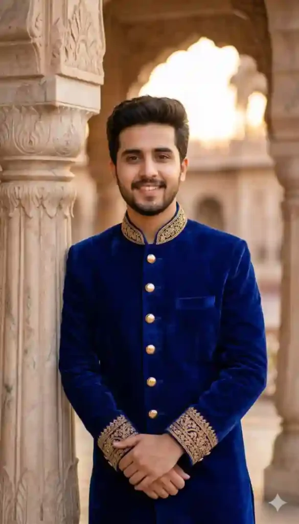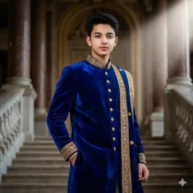 Paste the royal blue velvet sherwani prompt into Midjourney or Gemini and render.
