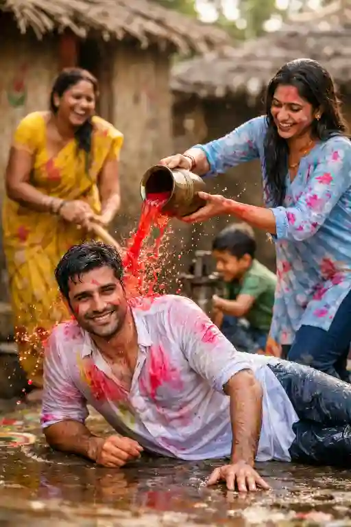 This rural Holi festival cinematic prompt delivers splash-frozen drama and authentic Indian vibes.