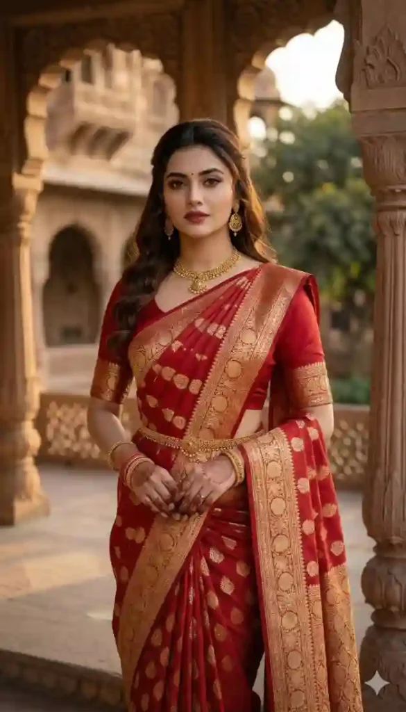 "Ultra-realistic portrait of an elegant Indian woman wearing an elegant red Banarasi silk saree with heavy golden zari border and matching blouse, standing in a historic palace courtyard, soft sunset lighting, royal mood, cinematic composition, 85mm portrait lens, shallow depth of field, intricate silk texture details, glowing jewelry reflections, photorealistic skin texture, dramatic shadows, ultra detailed fabric folds, 8K resolution, highly cinematic atmosphere."