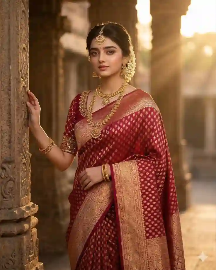 "Indian bridal model wearing a deep crimson Banarasi silk saree with rich golden zari border, ornate gold jewelry, matching blouse, posing gracefully near temple architecture, warm golden lighting, cinematic bridal mood, professional fashion photography, 50mm lens, soft depth of field, ultra-detailed silk weave texture, glowing skin tones, luxurious cultural aesthetic, studio quality realism, volumetric light rays, 8K hyper-realistic image."