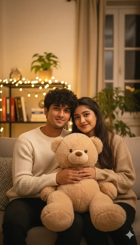 “Use the uploaded image of me and my girlfriend as the exact identity reference. Do not change faces, skin tone, height, or body proportions. Keep expressions natural and identical. Create a cozy indoor Teddy Day moment where we sit close on a sofa holding a soft teddy bear together, smiling gently. Both wear warm knit sweaters in beige and cream tones. Add soft fairy lights behind us, warm indoor lighting, cinematic depth of field, ultra-realistic DSLR lifestyle photography, no face swap, no new people.”
