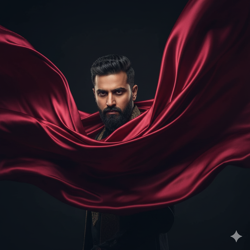 Ultra-HD studio shot of an Indian man in a black turtleneck, arms crossed, subtle dust particles illuminated by rim light, dramatic moody look, premium editorial detail.
